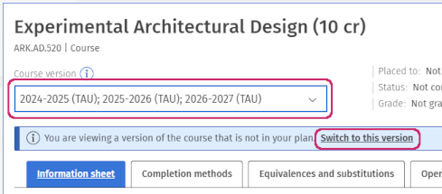 3. For each course, select the version that includes the academic year you are registering for. (First, select the version from the drop-down menu and then select Switch to this version.)