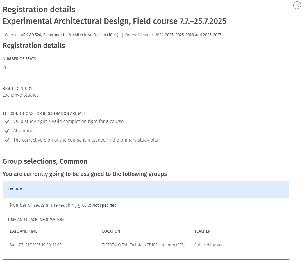 You can get more information about your registrations by selecting Open registration details. Registration details include, for example, conditions for registration and whether you meet the conditions, as well as teaching groups and which teaching groups you have been assigned to (or a prediction of your placement into groups, when your registration has not been processed yet).