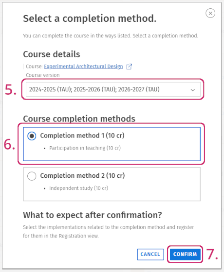 - Select completion method. (NB: When choosing a completion method you do not see what course implementations are offered for the completion method and when they are offered. By selecting the course's name you can open the course information sheet where you can find more information on the Completion methods tab.)