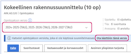 - Valitse jokaiselle opintojaksolle versio, jossa on mukana se lukuvuosi, jolle olet ilmoittautumassa. (Valitse ensin opintojakson versio pudotusvalikosta ja sen jälkeen Ota käyttöön tämä versio.)