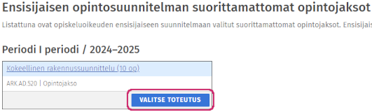 - Etsi kohdasta Ensisijaisen opintosuunnitelman suorittamattomat opintojaksot se opintojakso, jolle olet ilmoittautumassa ja valitse sen kohdalta Valitse toteutus.