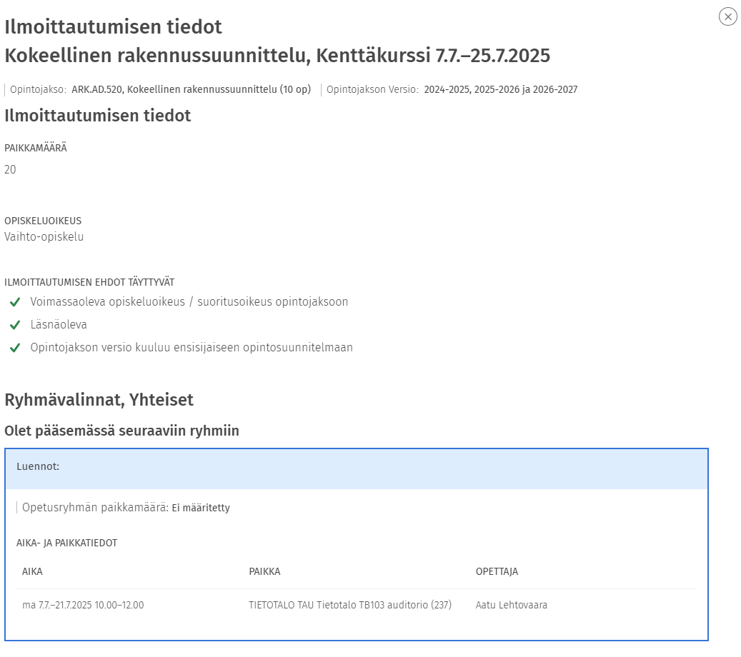 Saat lisää tietoja ilmoittautumisestasi valitsemalla ilmoittautumisen kohdalta Avaa ilmoittautumisen tiedot. Ilmoittautumisen tiedoissa ovat esimerkiksi ilmoittautumisen ehdot ja niiden täyttyminen sekä toteutuksen opetusryhmät ja mihin opetusryhmiin sinut on sijoitettu (tai ennuste sijoittamisesta silloin kun ilmoittautumistasi ei vielä ole käsitelty).