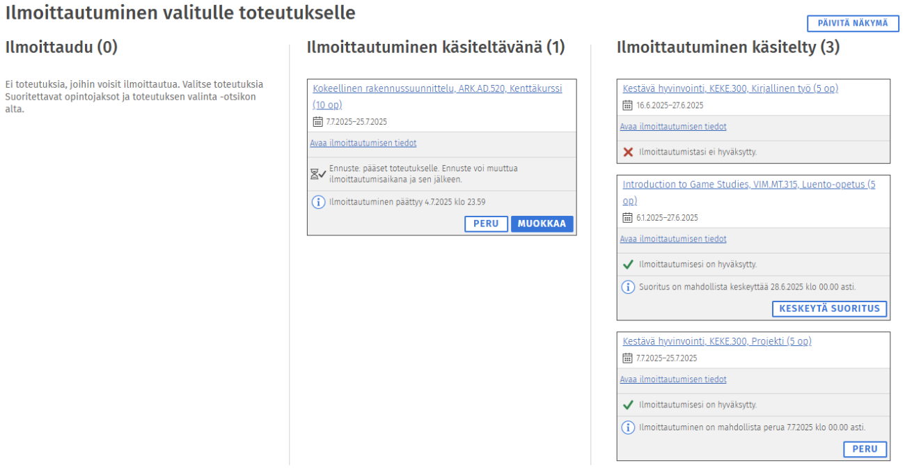 Ilmoittautumisesi ovat Ilmoittautuminen-välilehden kohdassa Ilmoittautuminen valitulle toteutukselle. Käsitellyissä ilmoittautumisissa näkyvät käynnissä olevat ja tulevat toteutukset joille ilmoittautumisesi on käsitelty. Päättyneet toteutukset ovat Opintokalenterin kohdassa Päättyneet ja keskeytetyt.