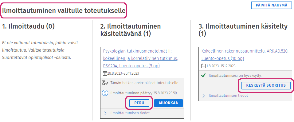 Kun ilmoittautuminen toteutukselle on päättynyt mutta toteutus ei ole vielä alkanut, et välttämättä pysty perumaan ilmoittautumistasi etkä keskeyttämään toteutuksen suorittamista. Ota näissä tilanteissa yhteyttä toteutuksen vastuuhenkilöön tai odota toteutuksen alkuun, jotta voit keskeyttää sen.